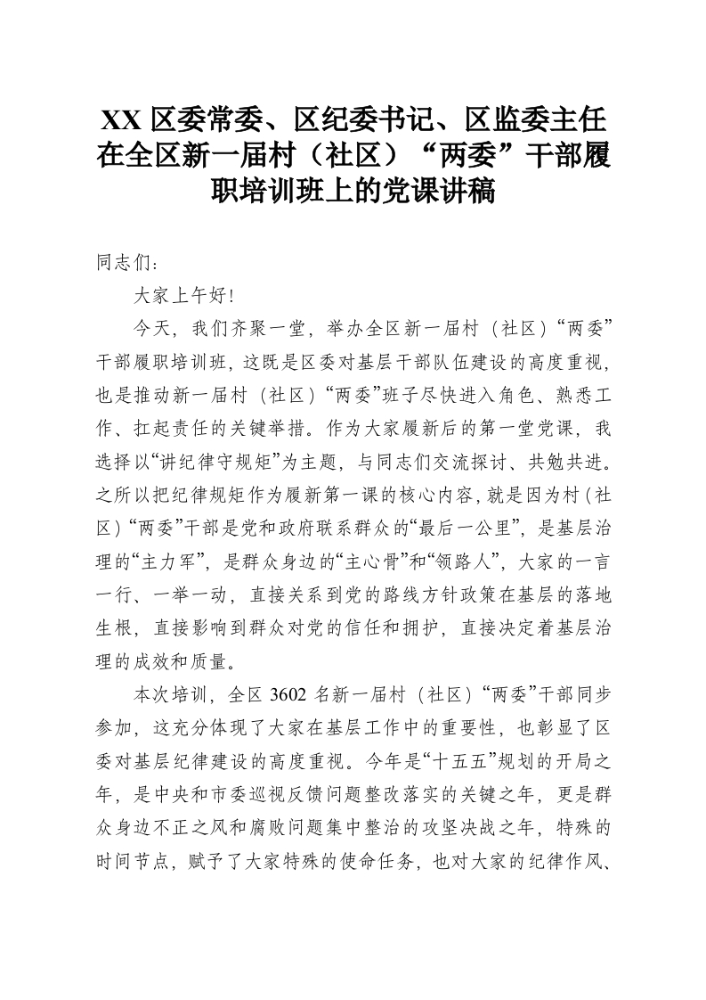 XX区委常委、区纪委书记、区监委主任在全区新一届村(社区)“两委”干部履职培训班上的党课讲稿