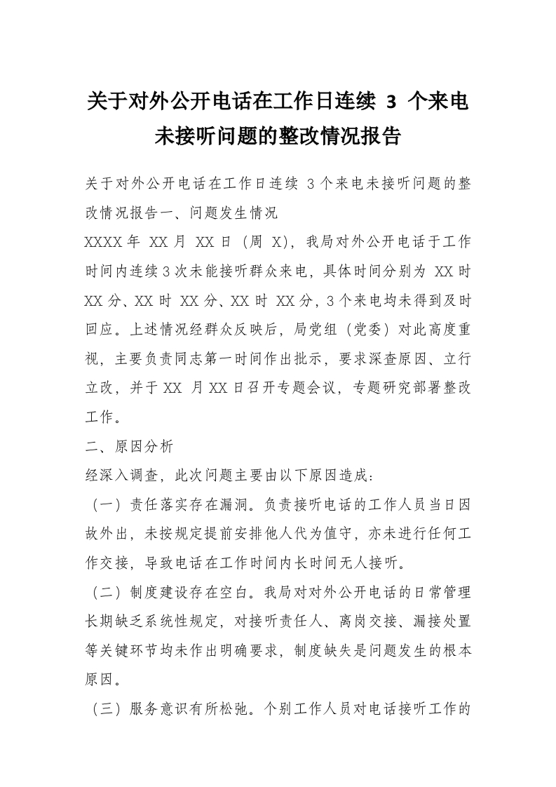 首页工作文档关于对外公开电话在工作日连续 3 个来电未接听问题的整改情况报告