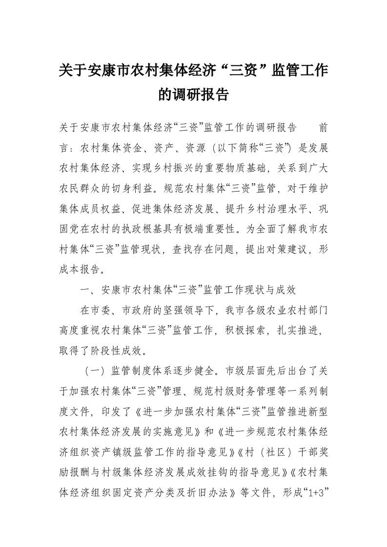 关于安康市农村集体经济“三资”监管工作的调研报告