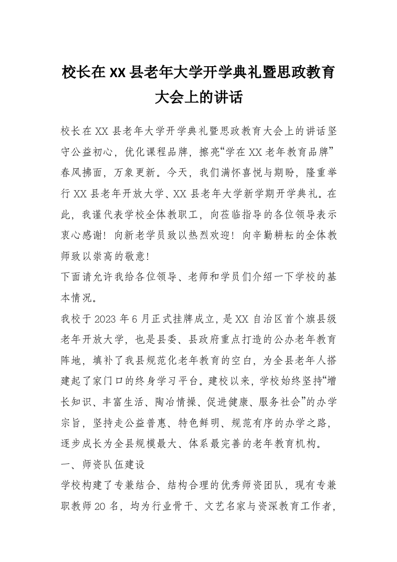校长在XX县老年大学开学典礼暨思政教育大会上的讲话