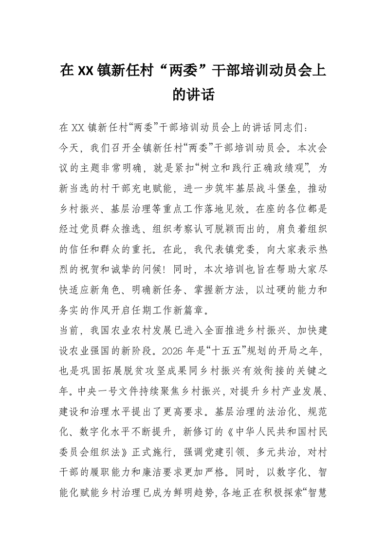 在XX镇新任村“两委”干部培训动员会上的讲话