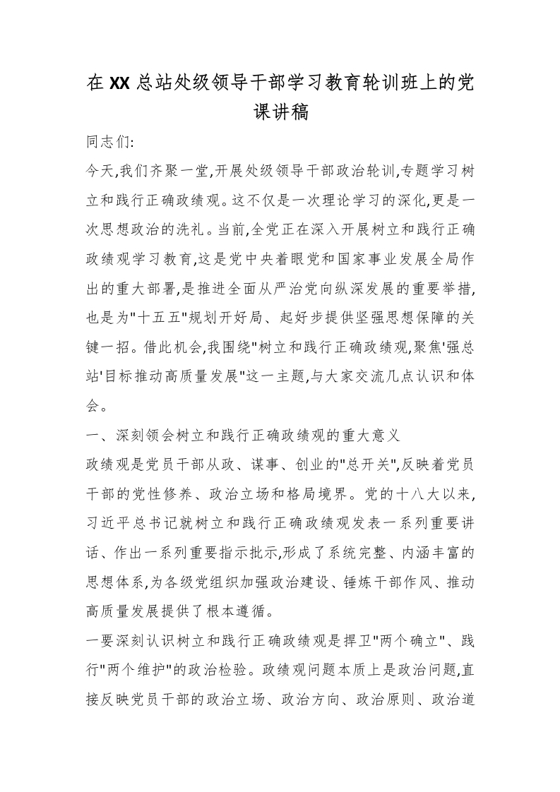 在XX总站处级领导干部学习教育轮训班上的党课讲稿