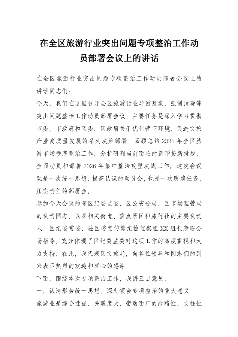 在全区旅游行业突出问题专项整治工作动员部署会议上的讲话