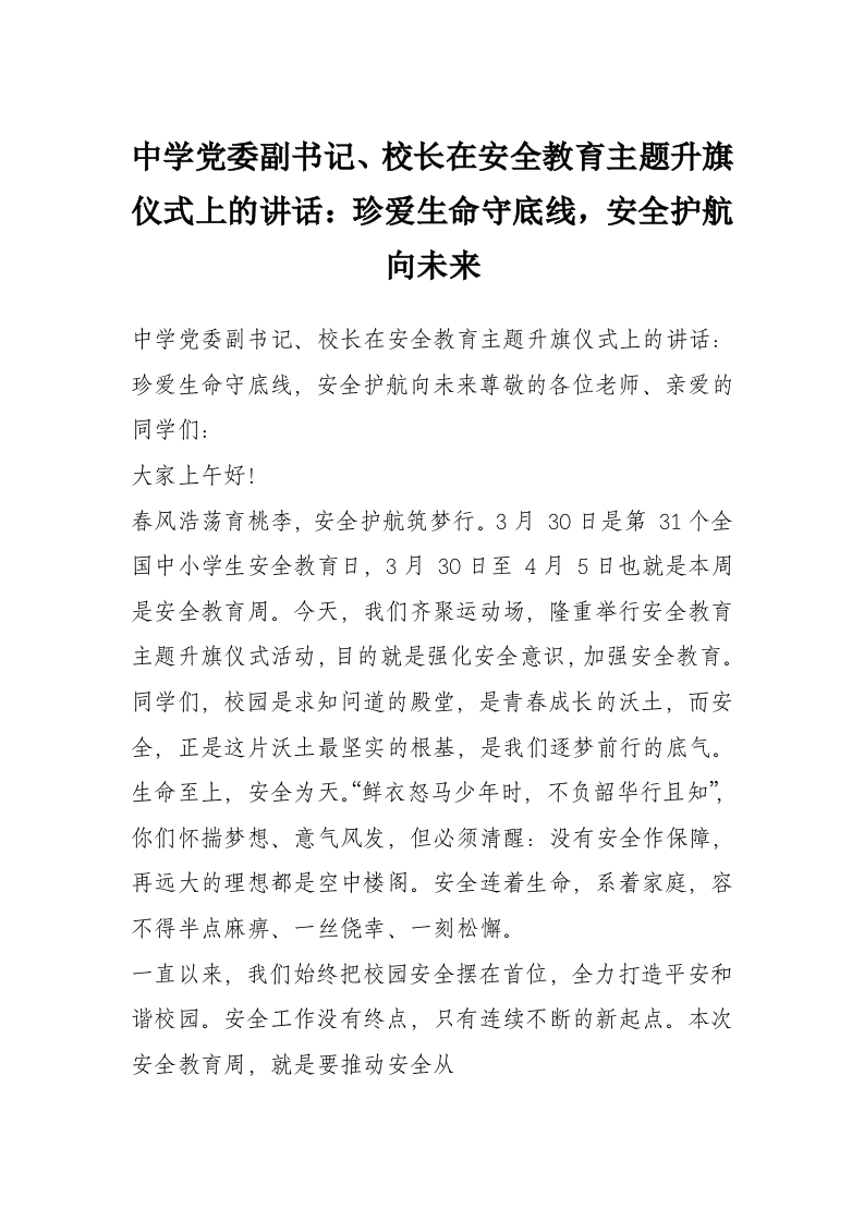 中学党委副书记、校长在安全教育主题升旗仪式上的讲话:珍爱生命守底线,安全护航向未来