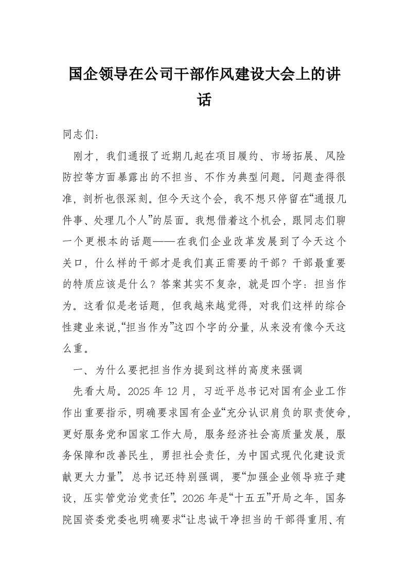 国企领导在公司干部作风建设大会上的讲话