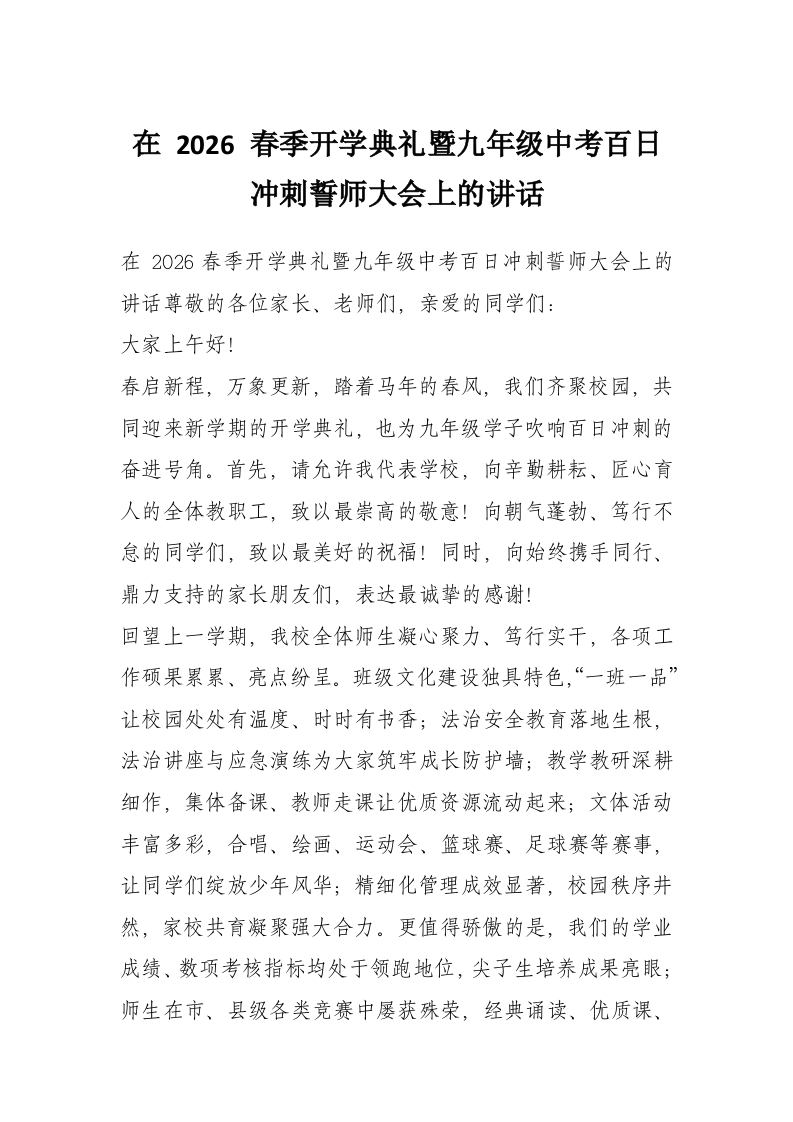 在 2026 春季开学典礼暨九年级中考百日冲刺誓师大会上的讲话