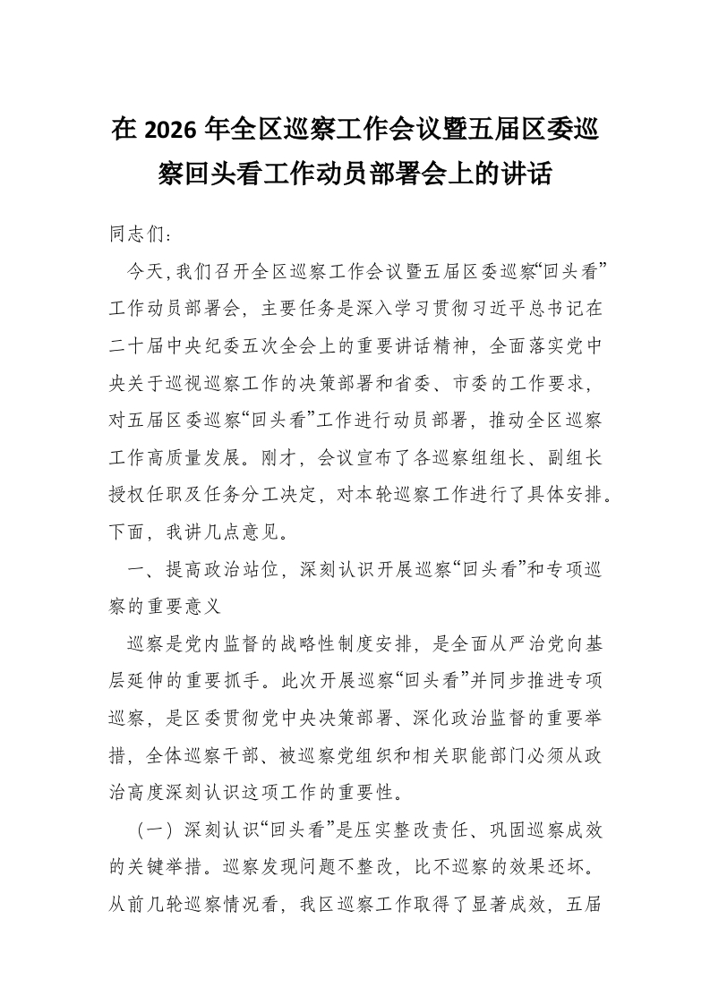 首页工作文档在2026年全区巡察工作会议暨五届区委巡察回头看工作动员部署会上的讲话