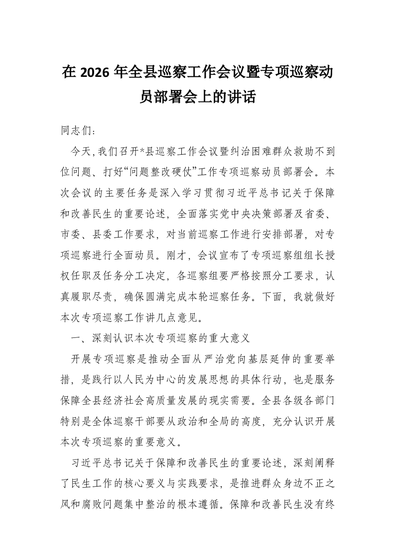 首页工作文档在2026年全县巡察工作会议暨专项巡察动员部署会上的讲话