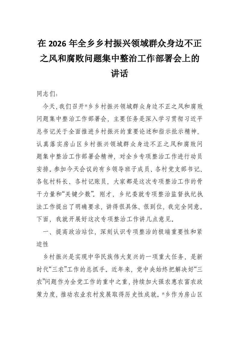 在2026年全乡乡村振兴领域群众身边不正之风和腐败问题集中整治工作部署会上的讲话