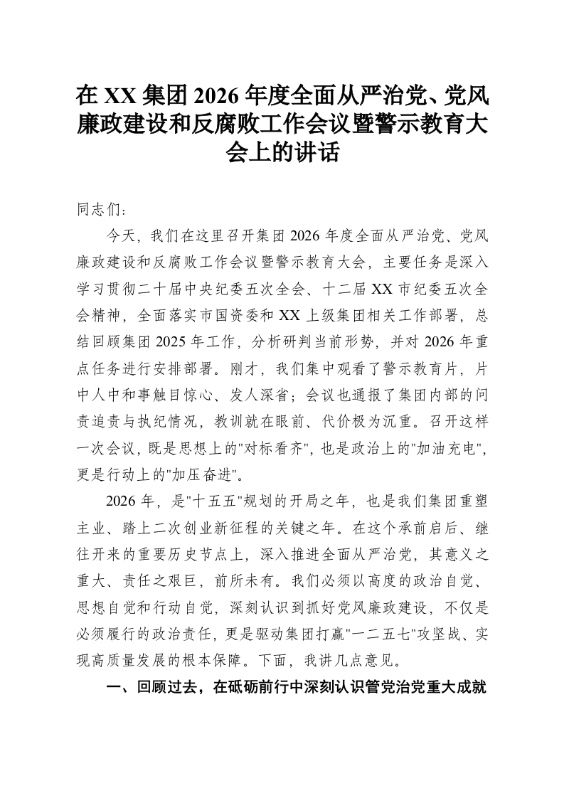 在XX集团2026年度全面从严治党、党风廉政建设和反腐败工作会议暨警示教育大会上的讲话