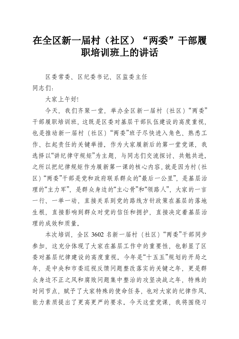 在全区新一届村(社区)“两委”干部履职培训班上的讲话