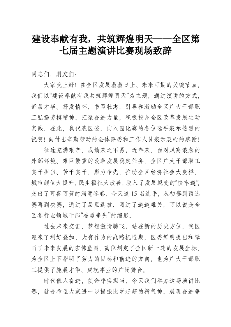 建设奉献有我,共筑辉煌明天——全区第七届主题演讲比赛现场致辞