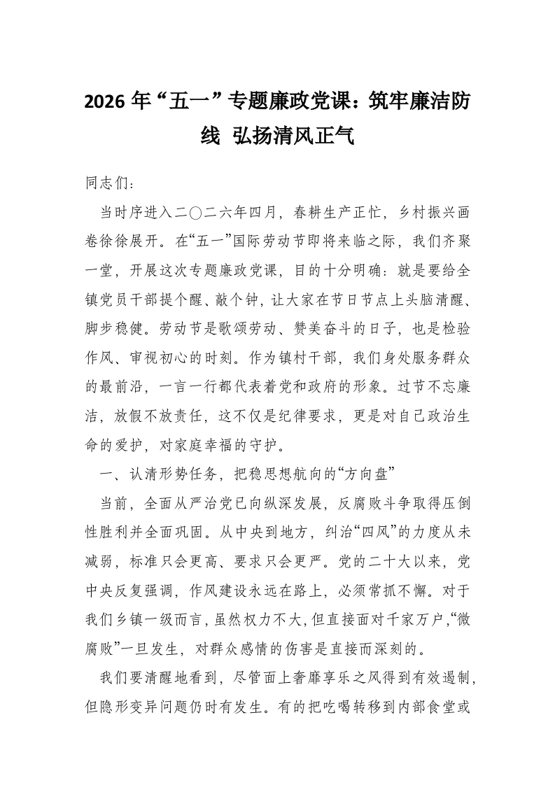 2026年“五一”专题廉政党课:筑牢廉洁防线 弘扬清风正气
