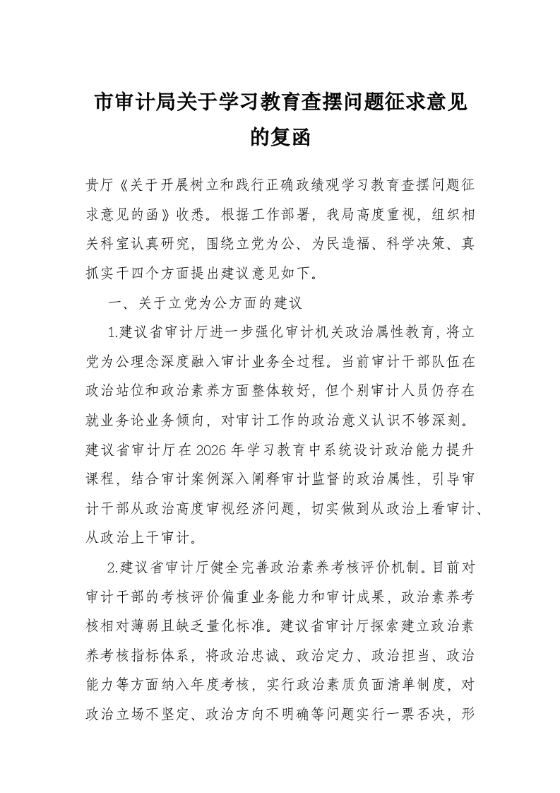 首页工作文档市审计局关于学习教育查摆问题征求意见的复函