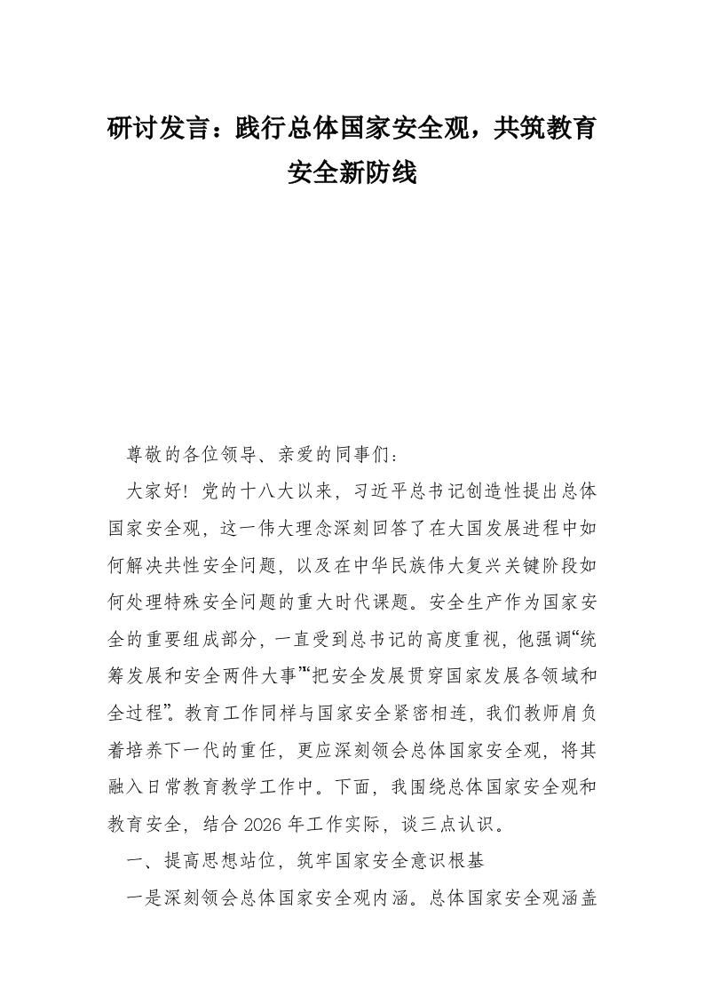 首页讲课讲稿研讨发言:践行总体国家安全观,共筑教育安全新防线