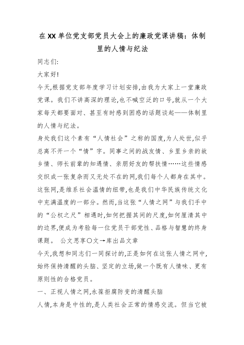 首页讲课讲稿在XX单位党支部党员大会上的廉政党课讲稿:体制里的人情与纪法