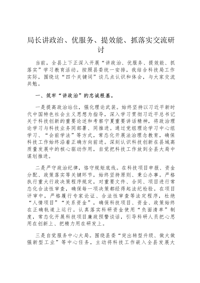 首页讲课讲稿局长讲政治、优服务、提效能、抓落实交流研讨