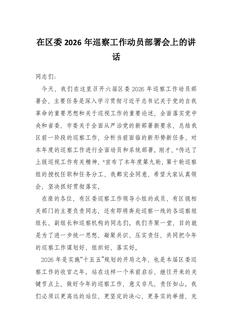 - 在2026年区委第一巡察组巡察回头看镇党委工作动员会上的讲话