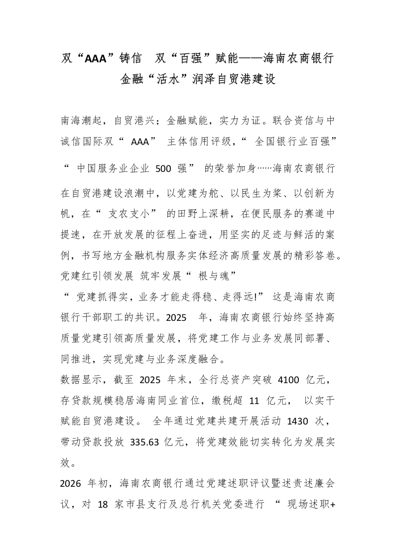 - 双“AAA”铸信 双“百强”赋能——海南农商银行金融“活水”润泽自贸港建设