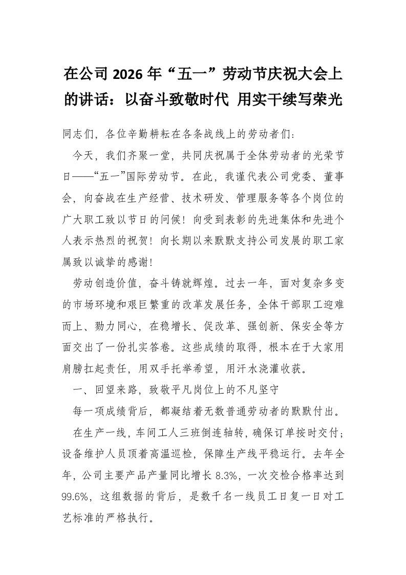 在公司2026年“五一”劳动节庆祝大会上的讲话:以奋斗致敬时代 用实干续写荣光