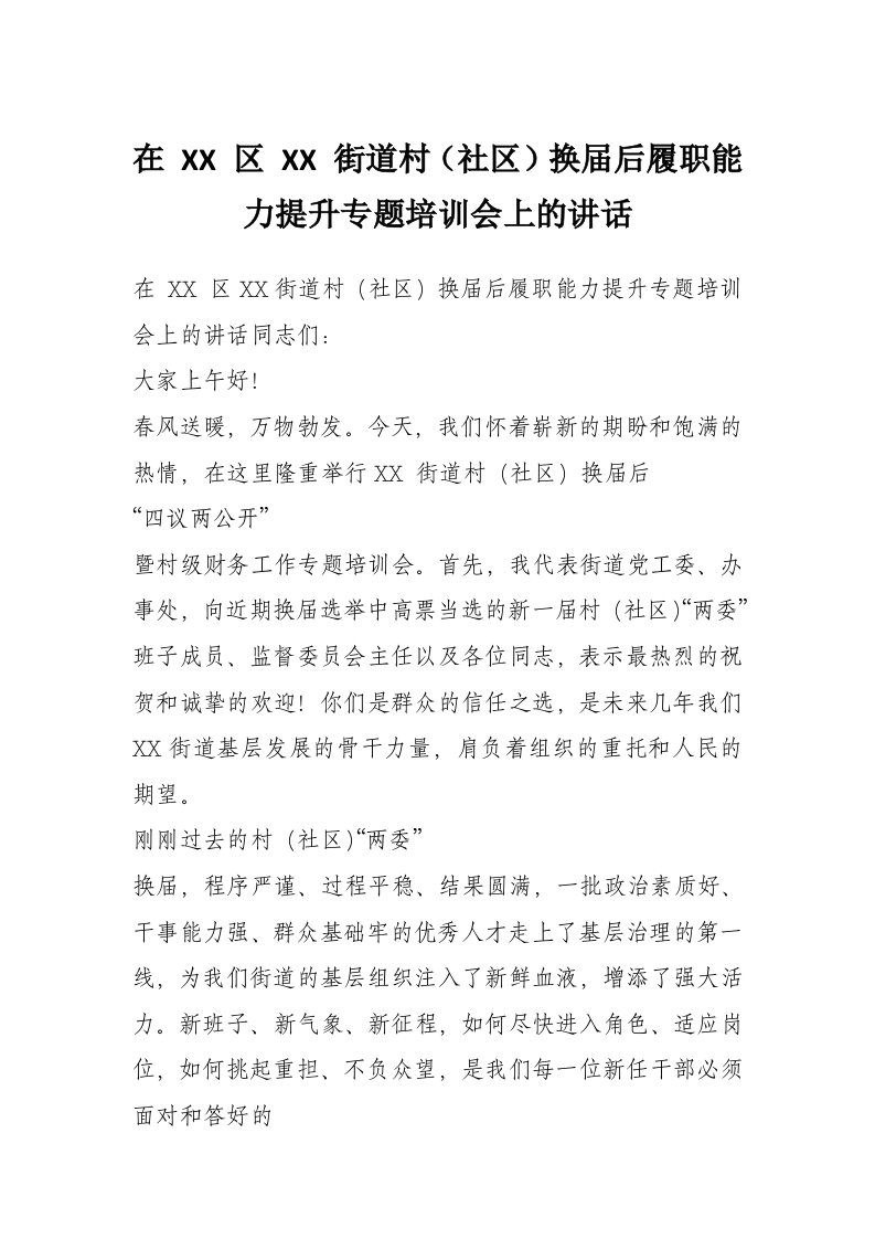 在 XX 区 XX 街道村(社区)换届后履职能力提升专题培训会上的讲话