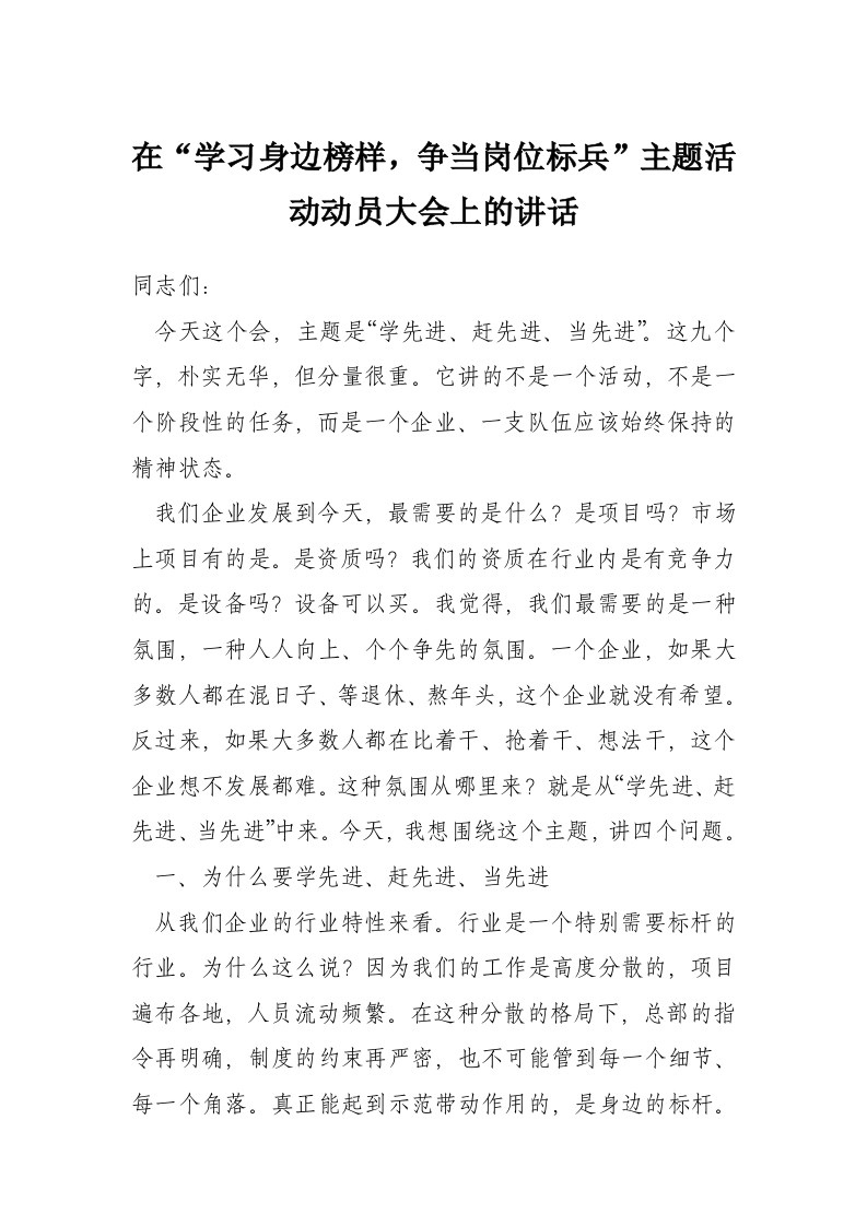 在“学习身边榜样,争当岗位标兵”主题活动动员大会上的讲话