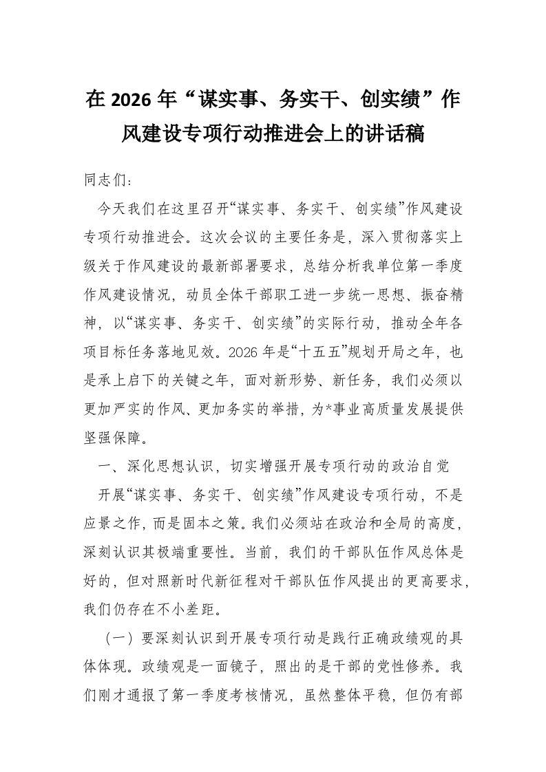 在2026年“谋实事、务实干、创实绩”作风建设专项行动推进会上的讲话稿