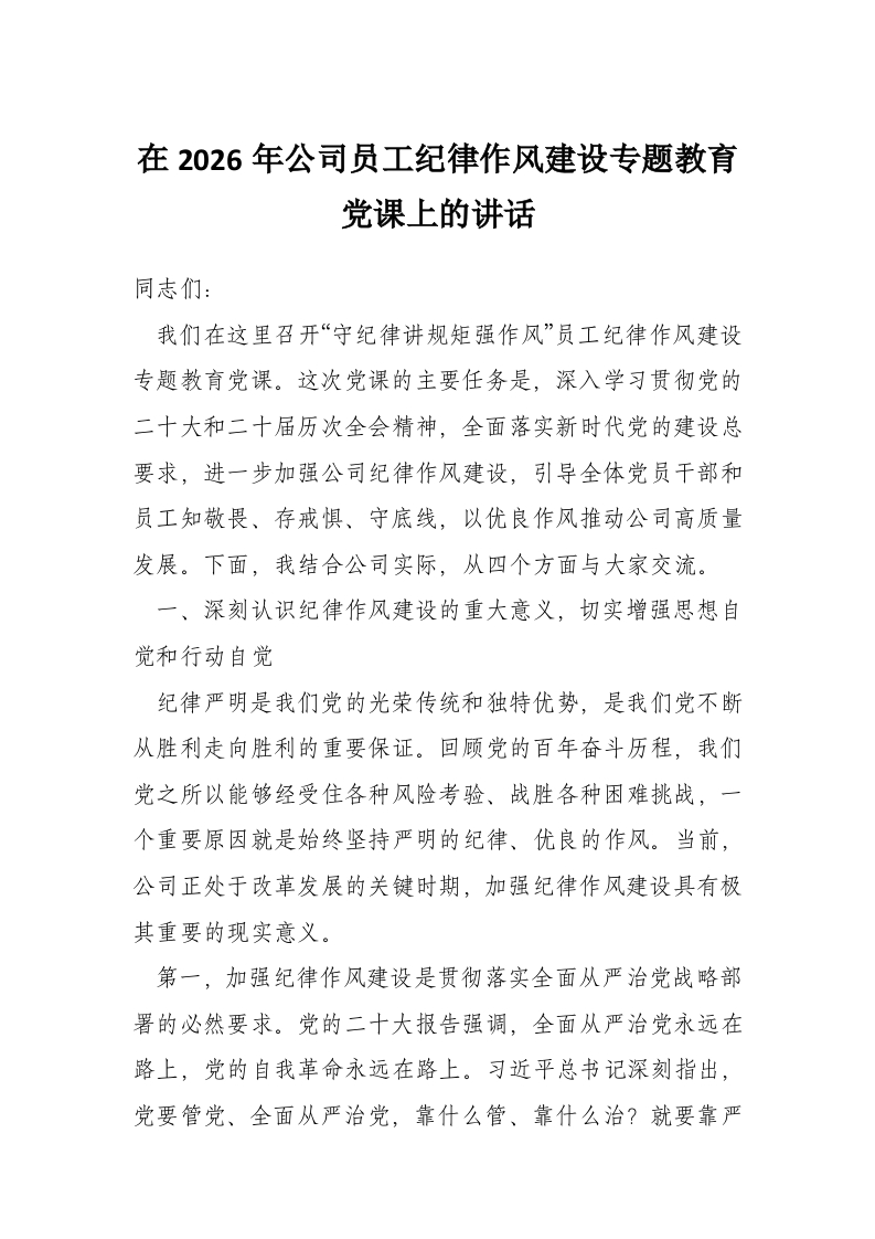 首页讲课讲稿在2026年公司员工纪律作风建设专题教育党课上的讲话