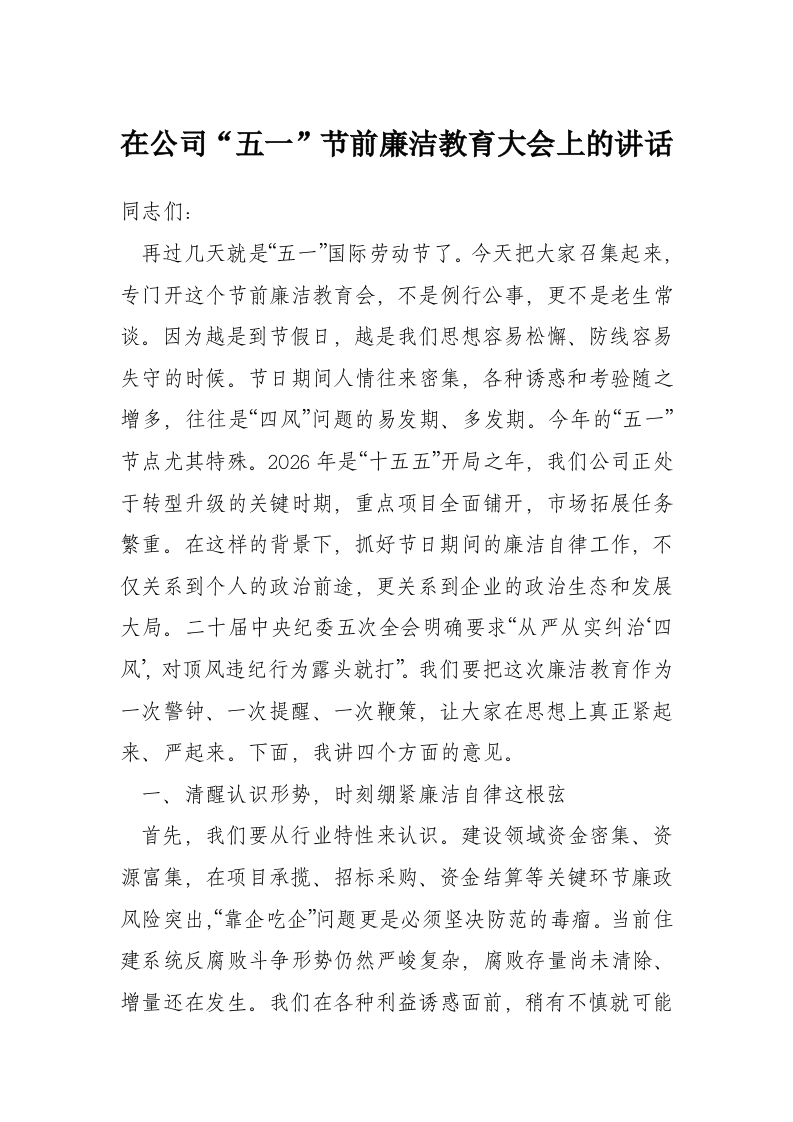 - 在公司2026年“五一”劳动节庆祝大会上的讲话:以奋斗致敬时代 用实干续写荣光