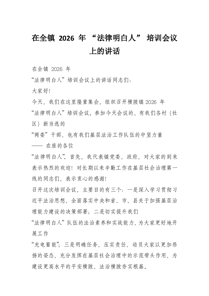在全镇 2026 年 “法律明白人” 培训会议上的讲话