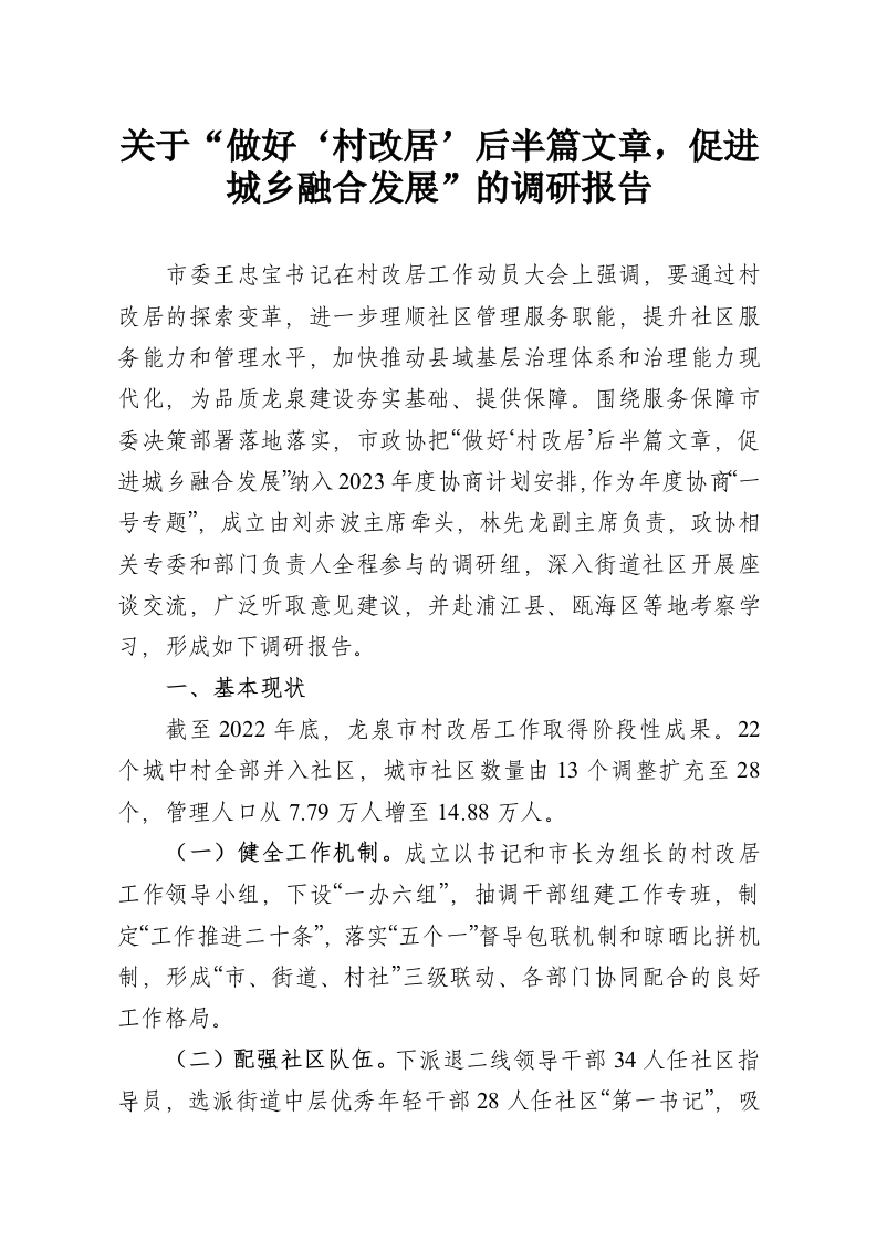 关于“做好‘村改居’后半篇文章,促进城乡融合发展”的调研报告