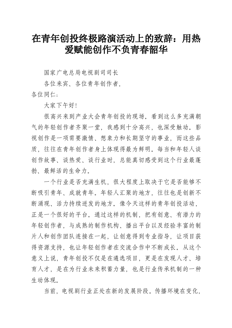 在青年创投终极路演活动上的致辞:用热爱赋能创作不负青春韶华
