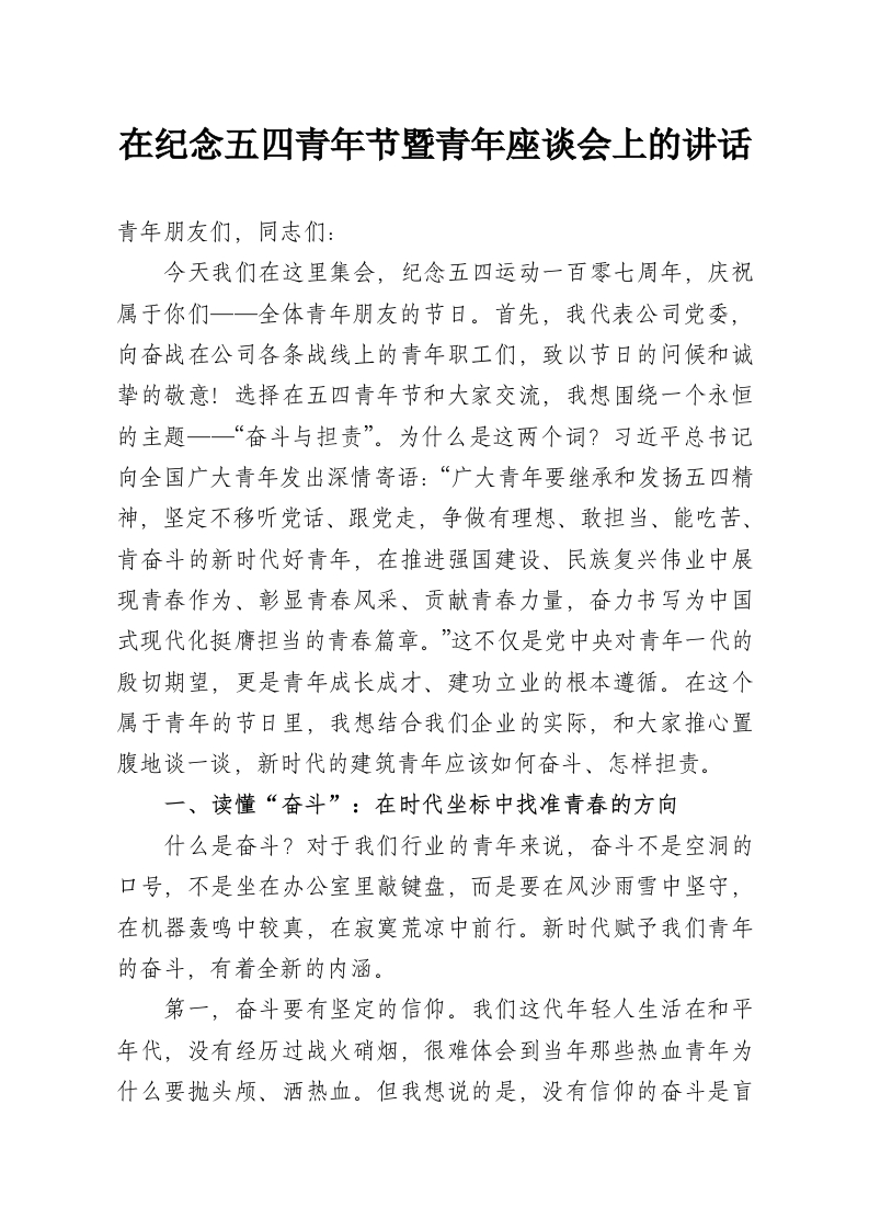 首页讲课讲稿在纪念五四青年节暨青年座谈会上的讲话