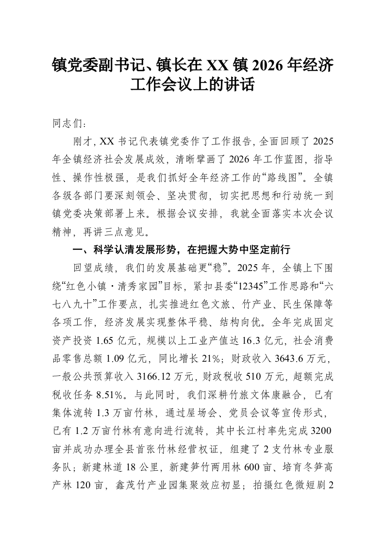 镇党委副书记、镇长在XX镇2026年经济工作会议上的讲话