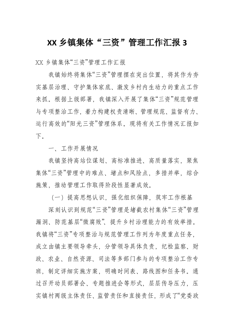 XX乡镇集体“三资”管理工作汇报3