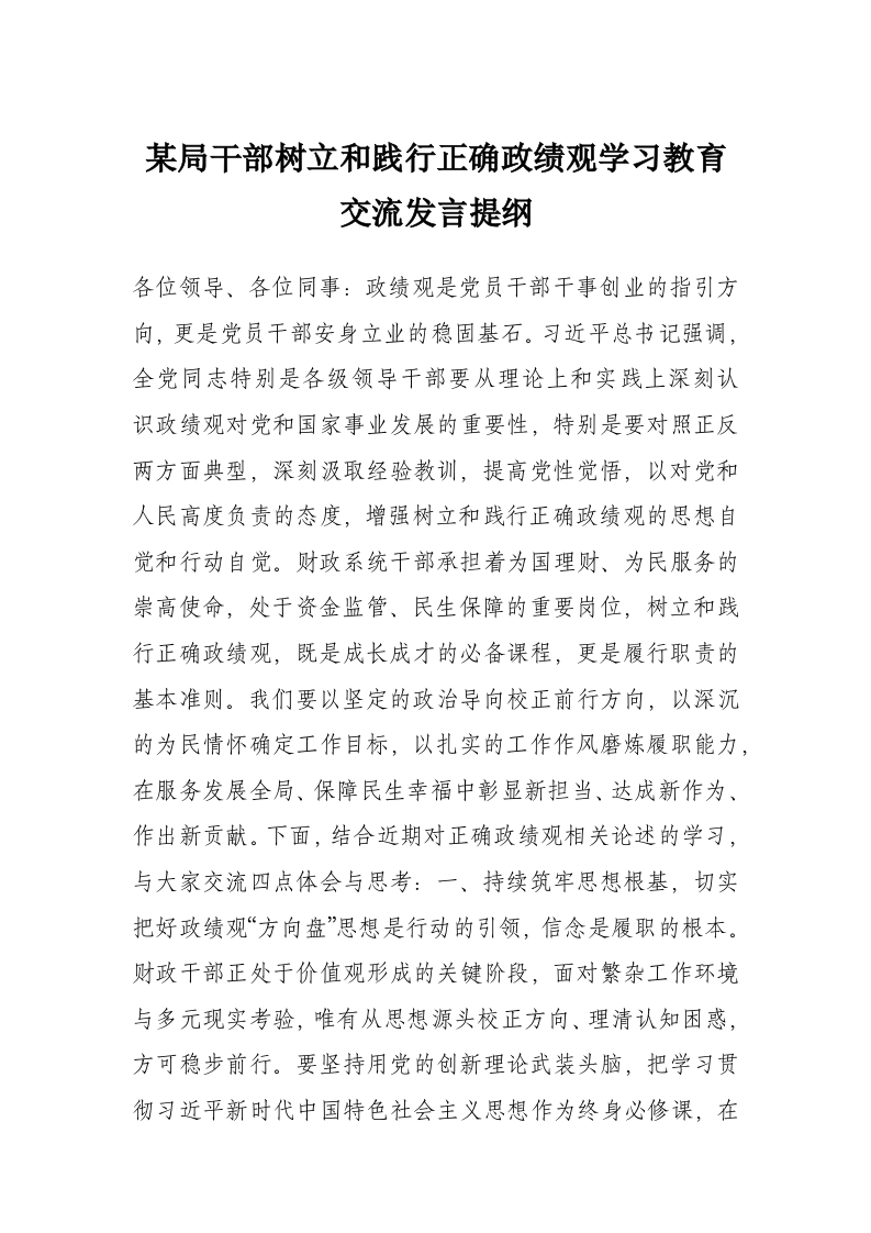 - 在政绩观学习教育中围绕“立党为公、为民造福、科学决策、正抓实干”的交流研讨发言提纲