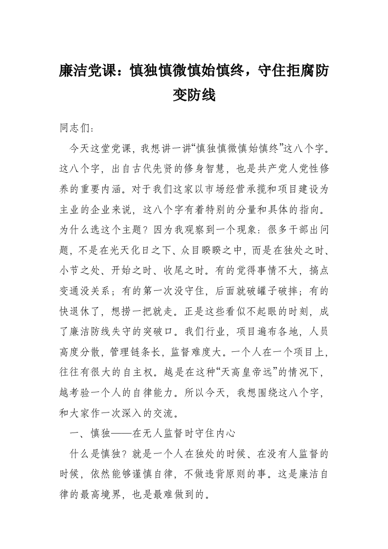 首页讲课讲稿廉洁党课:慎独慎微慎始慎终,守住拒腐防变防线