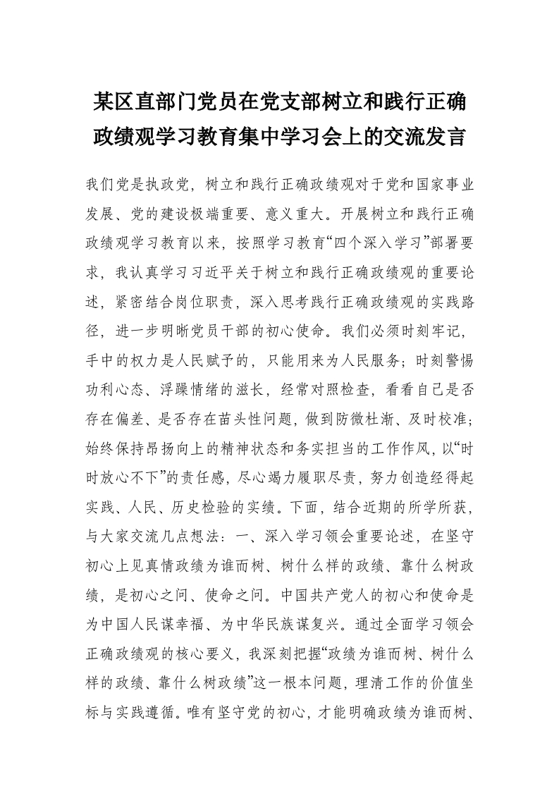 首页讲课讲稿某区直部门党员在党支部树立和践行正确政绩观学习教育集中学习会上的交流发言