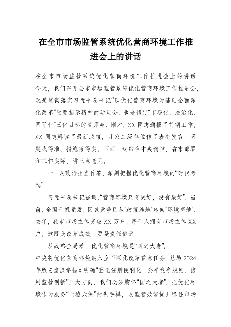 首页工作文档在全市市场监管系统优化营商环境工作推进会上的讲话
