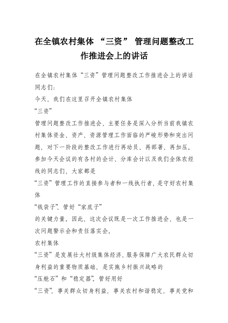 - 在全镇农村集体 “三资” 专项整治暨财务规范化管理培训会议上的讲话
