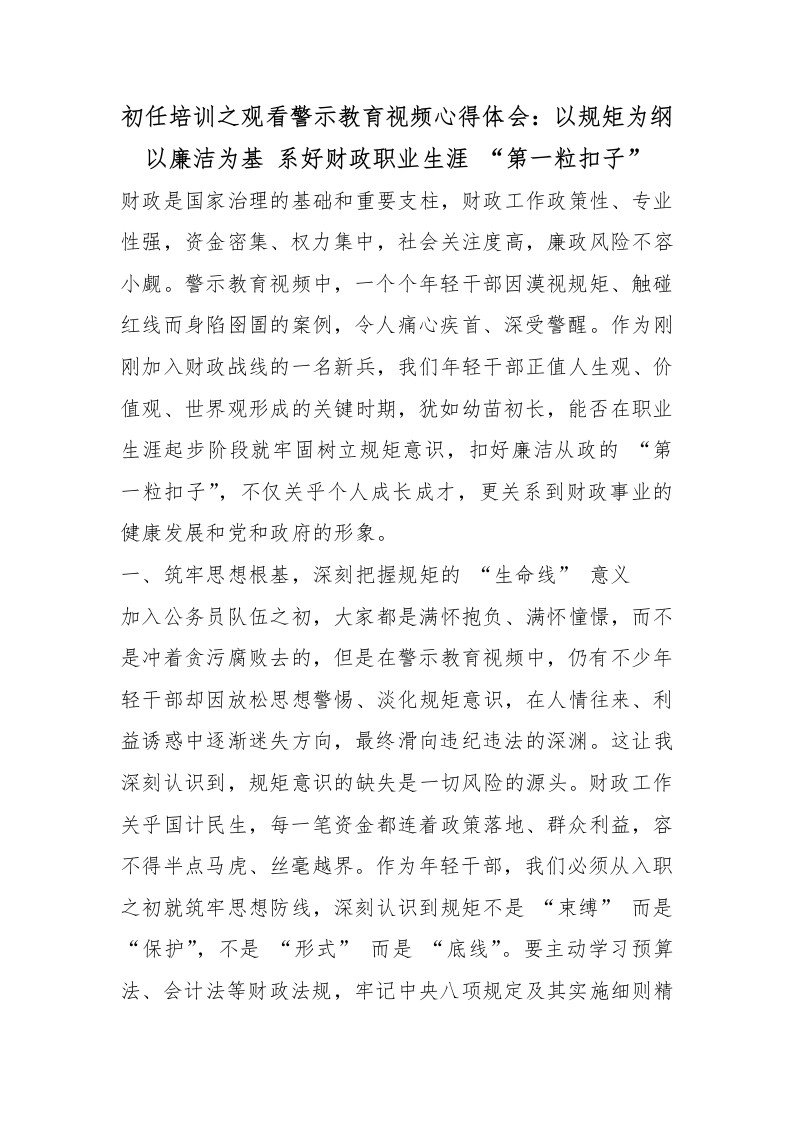 - 初任培训之观看警示教育视频心得体会:以规矩为纲以廉洁为基系好财政职业生涯“第一粒扣子”