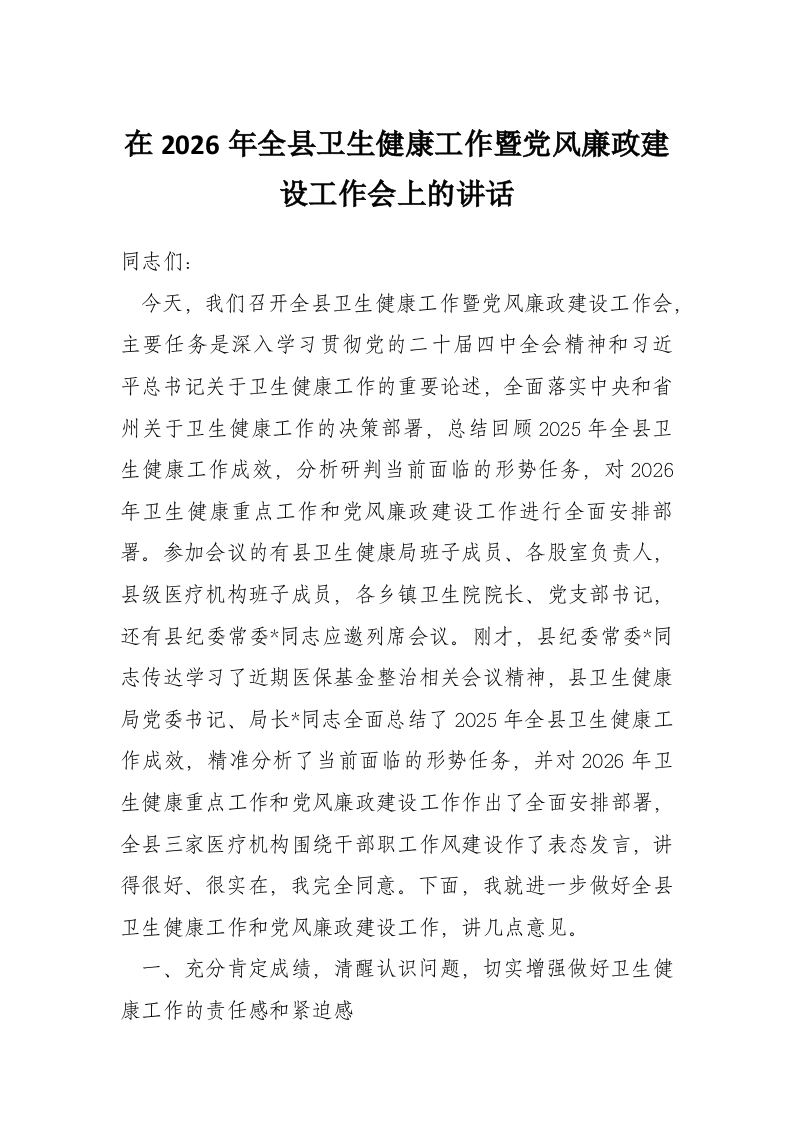 - 在2026年市委统一战线工作领导小组会议上的讲话