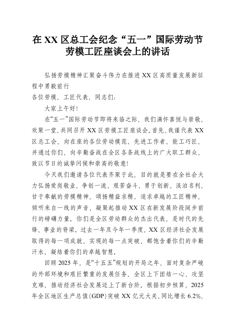 在XX区总工会纪念“五一”国际劳动节劳模工匠座谈会上的讲话