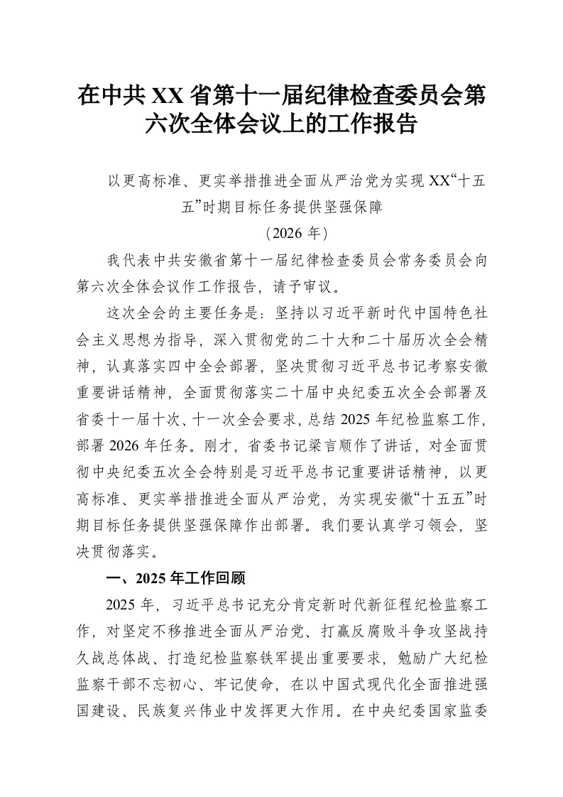 在中共XX省第十一届纪律检查委员会第六次全体会议上的工作报告