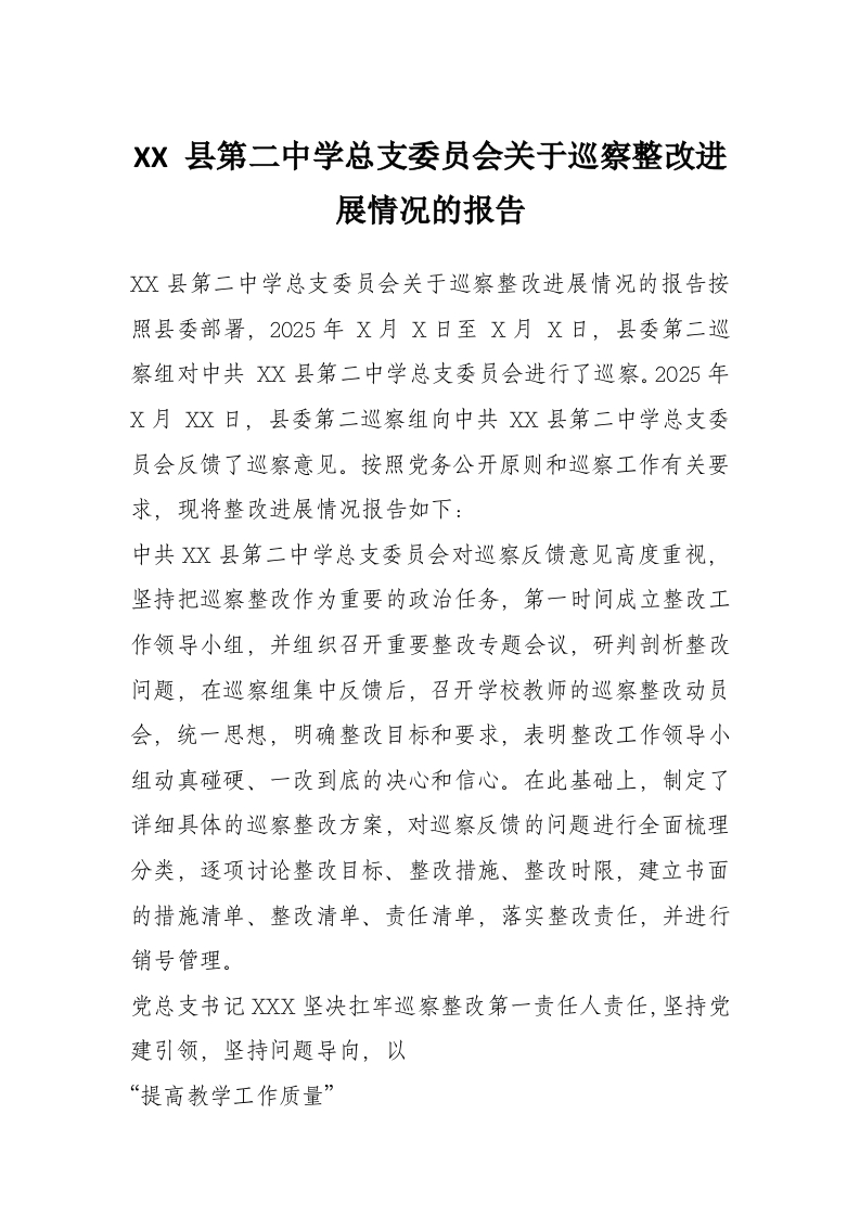 首页工作文档XX 县第二中学总支委员会关于巡察整改进展情况的报告