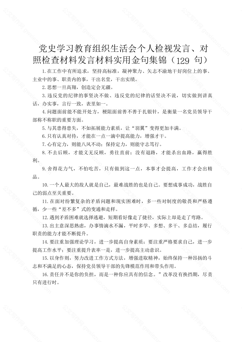 党史学习教育组织生活会个人检视发言、对照检查材料发言材料实用金句集锦(129句)