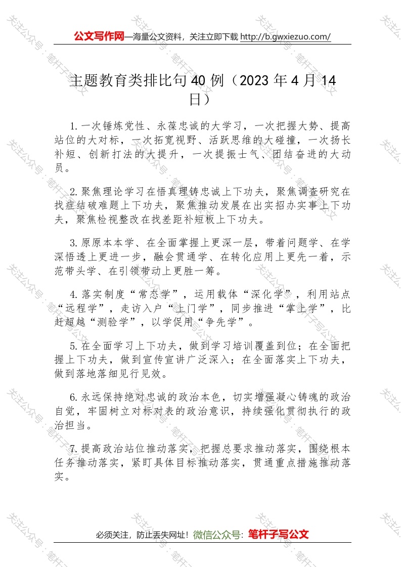 关注公众号:笔杆子关注公文写作网一海量公文资料,关注立即下载http/b.gwxiezuo.com/题教育类排比句40例(2023年4月14日)1.一次锤炼党性、永葆忠诚的大学习,一次把握大势、提高站位的大对标,匹次拓宽视野、活跃思维的大碰撞,一次扬长关注公众号补短、创新打法的大提升,一次提振士气、团结奋进的大动员。号号找症结破难题上下功夫,聚焦推动发展在出实招办实事上下功夫,聚焦检视整改在找差距补短板上下功夫。3.原原本本学、在全面掌握上更深一层,带着问题学、在学深悟透上更进一步,融会贯通学、在转化应用上更先一着,示关注公众号范带头学、在引领带动上更胜一筹。关注公4.落实制度“常态学”,运用载体“深化学”,利用站点“远程学”,走访入户“上门学”,同步推进“掌上学”,比赶超越“测验学”,以学促用“争先学”。子写5.在全面学习上下功夫,做到学习培训覆盖到位;在全面把握上下功夫,做到宣传宣讲广泛深入;在全面落实上下功夫,做到落地落细见行见效。关注公众号6.永远保持绝对忠诚的政治本色,切实增强凝心铸魂的政治自觉,牢固树立对标对表的政治意识,持续强化贯彻执行的政治担当。笔不,提高政治站位推动落实,把握总要求推动落实,围绕根本任务推动落实,紧盯具体目标推动落实,贯通重点措施推动落实。关注公众号:笔杆关注关必须关注,防止丢失网址!微信公众号:笔杆子写公文笔杆笔
