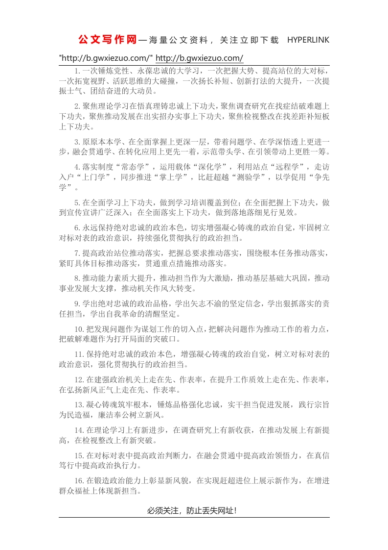 公文写作网一海量公文资料,关注立即下载HYPERLINK"http://b.gwxiezuo.com/"http://b.gwxiezuo.com/1.一次锤炼党性、永葆忠诚的大学习,一次把握大势、提高站位的大对标,一次拓宽视野、活跃思维的大碰撞,一次扬长补短、创新打法的大提升,一次提振士气、团结奋进的大动员。2.聚焦理论学习在悟真理铸忠诚上下功夫,聚焦调查研究在找症结破难题上下功夫,聚焦推动发展在出实招办实事上下功夫,聚焦检视整改在找差距补短板上下功夫。3.原原本本学、在全面掌握上更深一层,带着问题学、在学深悟透上更进一步,融会贯通学、在转化应用上更先一着,示范带头学、在引领带动上更胜一筹。4.落实制度“常态学”,运用载体“深化学”,利用站点“远程学”,走访入户“上门学”,同步推进“掌上学”,比赶超越“测验学”,以学促用“争先学”5.在全面学习上下功夫,做到学习培训覆盖到位:在全面把握上下功夫,做到宣传宣讲广泛深入:在全面落实上下功夫,做到落地落细见行见效。6.永远保持绝对忠诚的政治本色,切实增强凝心铸魂的政治自觉,牢固树立对标对表的政治意识,持续强化贯彻执行的政治担当。7.提高政治站位推动落实,把握总要求推动落实,围绕根本任务推动落实,紧盯具体目标推动落实,贯通重点措施推动落实。8.推动能力素质大提升,推动担当作为大激励,推动基层基础大巩固,推动事业发展大支撑,推动机关作风大转变。9.学出绝对忠诚的政治品格,学出矢志不渝的坚定信念,学出狠抓落实的责任担当,学出自我革命的清醒坚定。10.把发现问题作为谋划工作的切入点,把解决问题作为推动工作的着力点,把破解难题作为打开局面的突破口。11.保持绝对忠诚的政治本色,增强凝心铸魂的政治自觉,树立对标对表的政治意识,强化贯彻执行的政治担当。12.在建强政治机关上走在先、作表率,在提升工作质效上走在先、作表率,在弘扬新风正气上走在先、作表率。13.凝心铸魂筑牢根本,锤炼品格强化忠诚,实干担当促进发展,践行宗旨为民造福,廉洁奉公树立新风。14.在理论学习上有新进步,在调查研究上有新收获,在推动发展上有新提高,在检视整改上有新突破。15.在对标对表中提高政治判断力,在融会贯通中提高政治领悟力,在真信笃行中提高政治执行力。16.在锻造政治能力上彰显新风貌,在实现赶超进位上展示新作为,在增进群众福祉上体现新担当。必须关注,防止丢失网址!