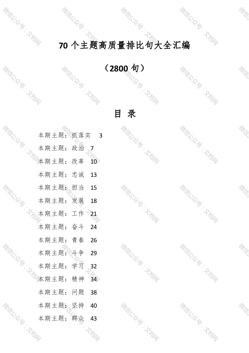 微信公众号:文档网微信公众号微信公众号:微信公众号:文档网70个主题高质量排比句大全汇编(2800句)微信公众号:文档网微信公众号:文档网微信公众号:文档网微信言公众号:文档网目录本期主题:抓落实3微信本期主题:政治7微信公众号:文档网微信公众号:文档网10本期主题:忠诚13本期主题:担当15微信公众号:文档网本期主题:发展18期主题:工作21微信公众号:文档网微信公众号:文档网期主题:奋斗24本期主题:青春26信公众号文本期主题:精神本期主题:斗争29本期主题:学习32微信公众号:文档网微信公众号:文档网微信34本期主题:问题38坚持40微信公众号:文档网本期主题:群众43文档网微信公众号:文档网微信公众号:文档网
